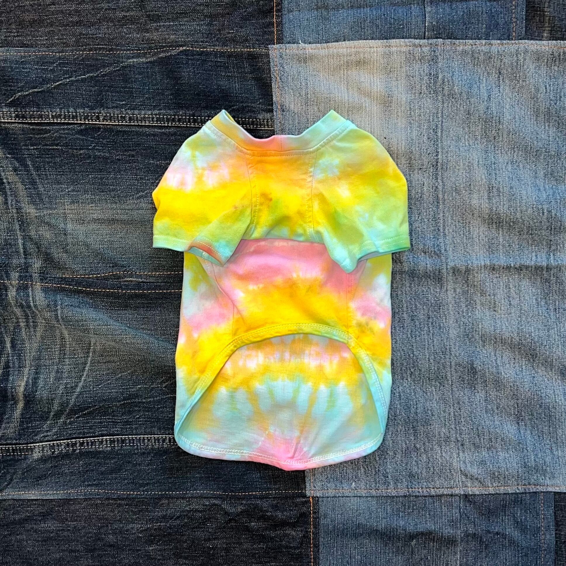 販売中! 一点一点手作業で染め上げました♡ スパイラル柄♡ イエロー×ピンク×ライトブルー XLサイズ 後ろ背丈 33cm 首周り 28cm バスト 48cm