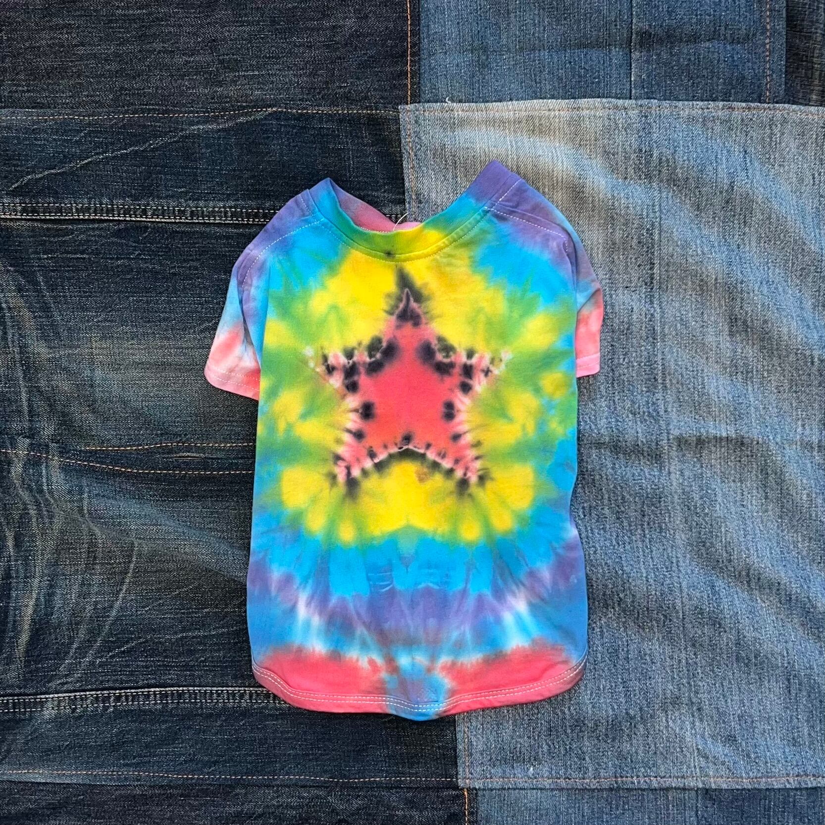 販売中! 一点一点手作業で染め上げました♡ スター柄⭐︎ レッド×イエロー×ブルー XLサイズ 後ろ背丈 33cm 首周り 28cm バスト 48cm